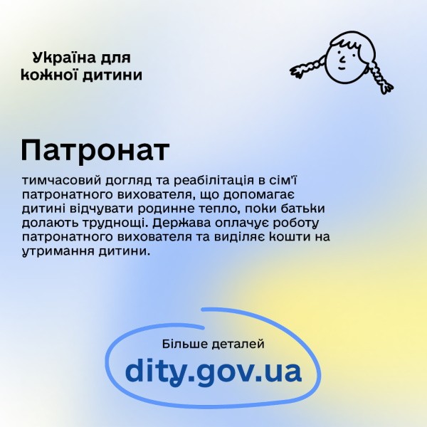 - Патронат: тимчасовий догляд та реабілітація в сім’ї патронатного вихователя, що допомагає дитині відчувати родинне тепло, поки батьки долають труднощі. Держава оплачує роботу патронатного вихователя та виділяє кошти на утримання дитини.