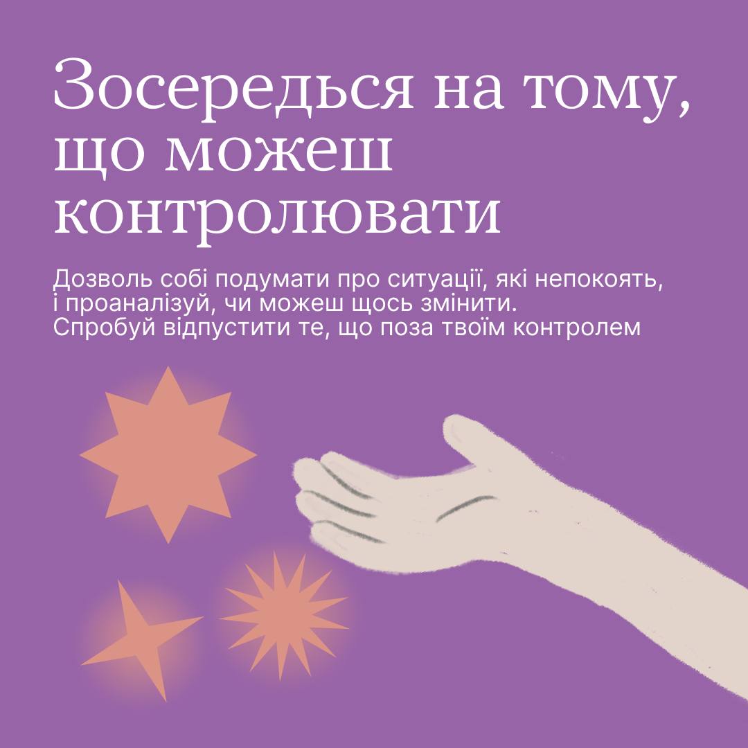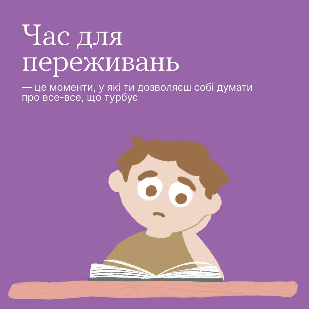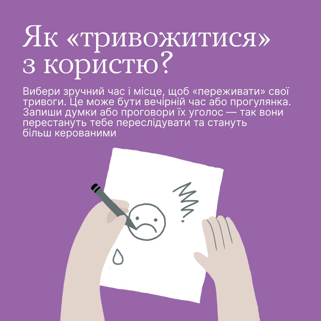 Спробуй визначити конкретний час, щоб спокійно обміркувати все, що тебе турбує. Це може бути декілька хвилин увечері перед сном або під час прогулянки.