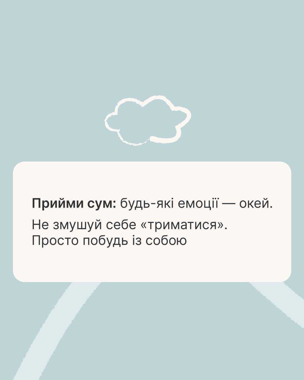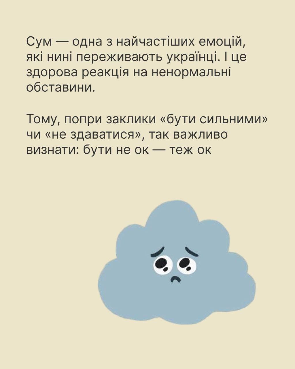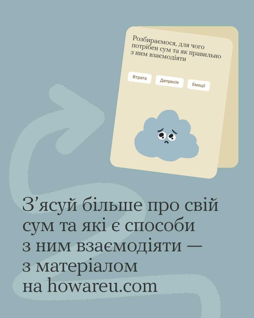 А якщо дозвіл на сумування звучить для тебе дивно чи сум із тобою вже досить довго, дізнайся, як бути. Розповідаємо в каруселі та на платформі howareu.com (http://howareu.com/materials/chomu–sumuvaty–tse–normalno?utm_source=telegram&utm_medium=post&utm_campaign=product_sm)